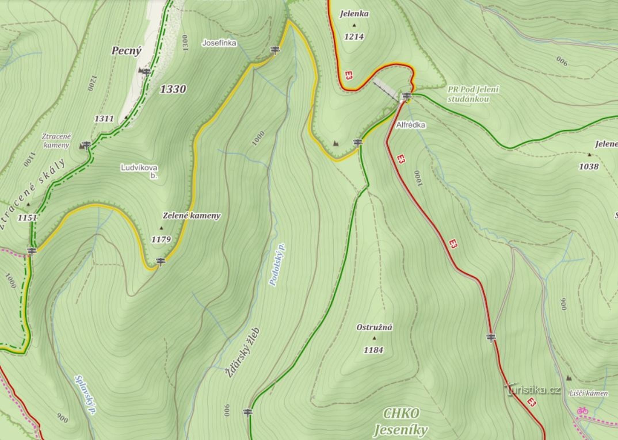 Půvabný, málo vyhledávaný výrazný vrchol jižně od bývalé turistické chaty Alfrédka. Přístup je po zelené turistické značce, kterou nad Mravenčím sedlem opustíme. Pokračujeme po málo používané lesní cestě (po nevýrazném hřebeni). Cesta postupně přechází v málo výrazný, ale chozený chodník. Ve vrcholové části strmě do řídkého lesa až k vrcholové skále a přístřešku.Z vrcholu je téměř kruhový rozhled…