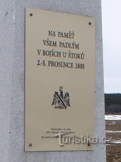 Památník bitvy Napoleonských vojsk u Štok roku 1805. Napoleon pak táhl dále směrem na Slavkov. Na poli za Památníkem proběhla tehdy bitva. Svědčí o ní i ještě do nedávna nacházené zlomky bodáků, šavlí a dalších součástí výzbroje.