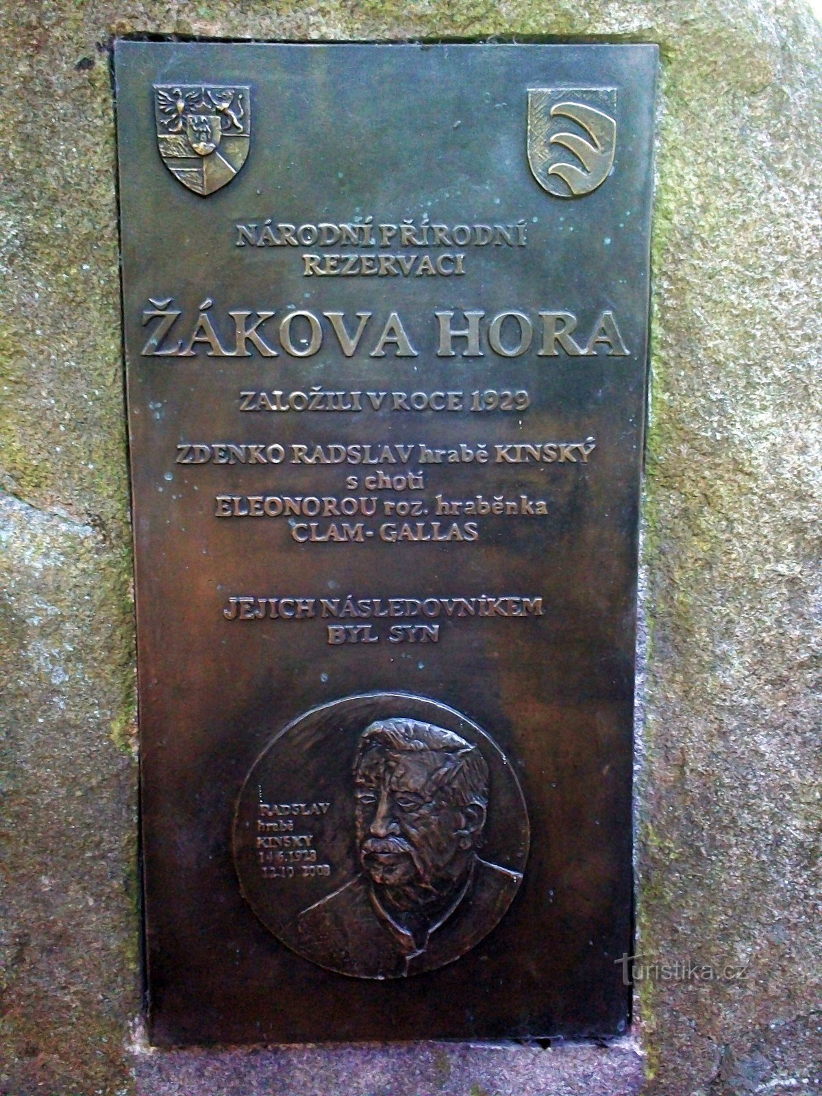 Památník zakladatelům Národní přírodní rezervace Žákova hora je postaven na rozcestí u křížení červené a zelené turistické značky.Na pamětní desce je text:Národní přírodní rezervaci Žákova hora založili v roce 1929 Zdenko Radslav hrabě Kinský s chotí Eleonorou roz. hraběnka Clam–Gallas. Jejich následovníkem byl syn Radslav hrabě Kinský 14.6.1928–12.10.2008.