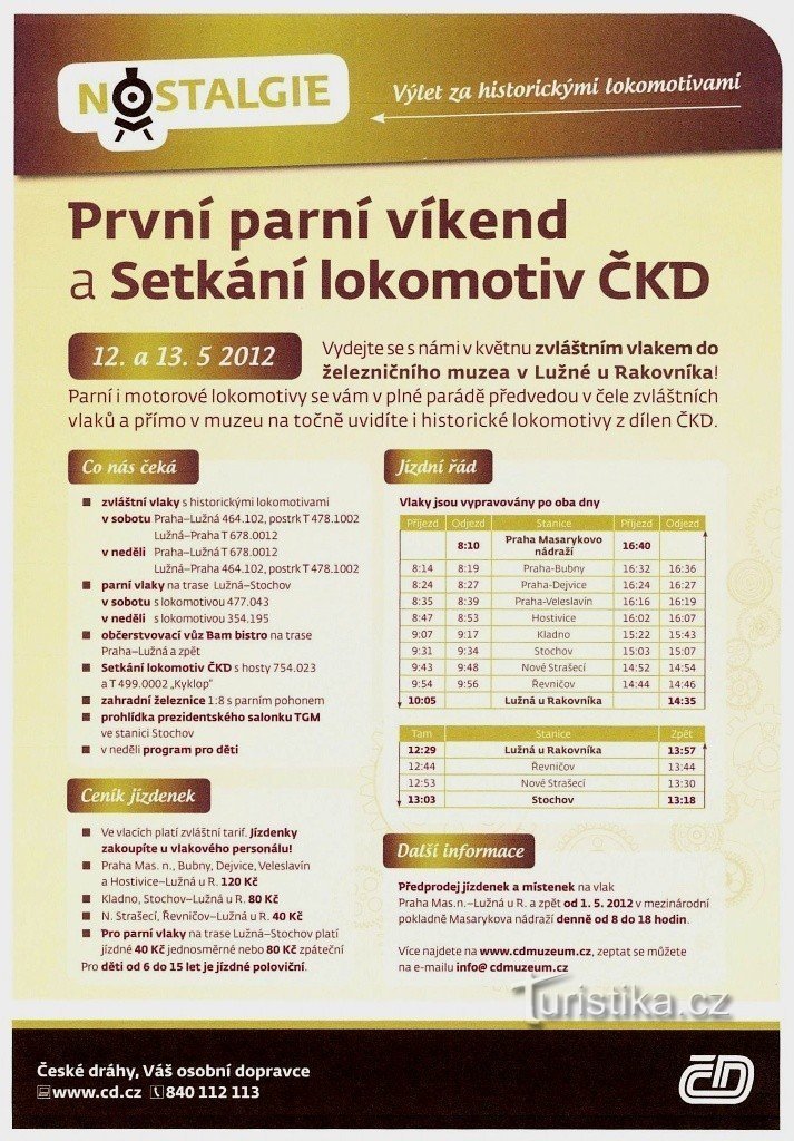 Na víkend 12.5. a 13.5. pro nás muzeu ČD připravilo jízdy zvláštními vlaky s historickými lokomotivami z Prahy Masarykova nádraží do muzea českých drah v Lužné u Rakovníka.