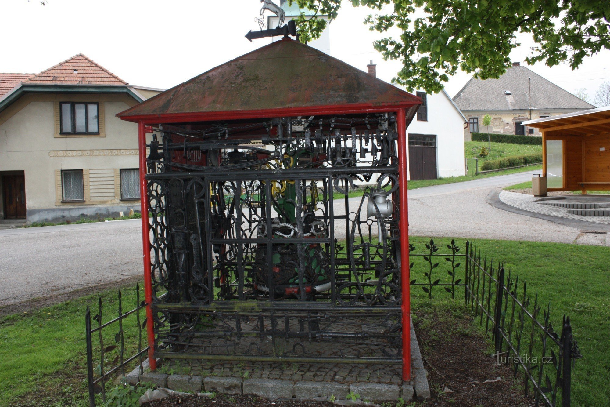 Na návsi v Miřeticích je umístěná druhá Kovářská práce Františka Uchytila a to stylizovaný železný…