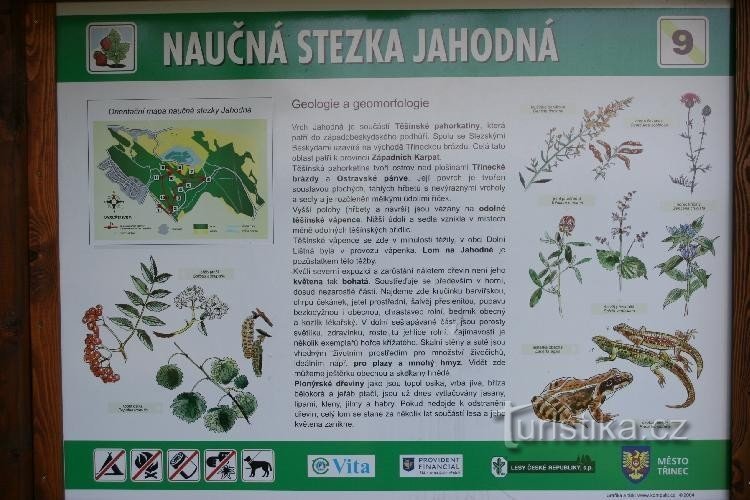 Pod Jahodnou je rozcestí červené a žluté turistické značky a nachází se na východním úbočí vrcholku Jahodná ( 407 m.n.m.), který se zvedá u východního okraje města Třince. Kromě turistických tras prochází tudy naučná stezka Jahodná a jedna z inrofmačních tabulí stezky je v sousedství rozcestníku. Po žluté značce dojdeme k tomuto rozcestí od hájenky, která je v místech zvaných Sosna. Červená…
