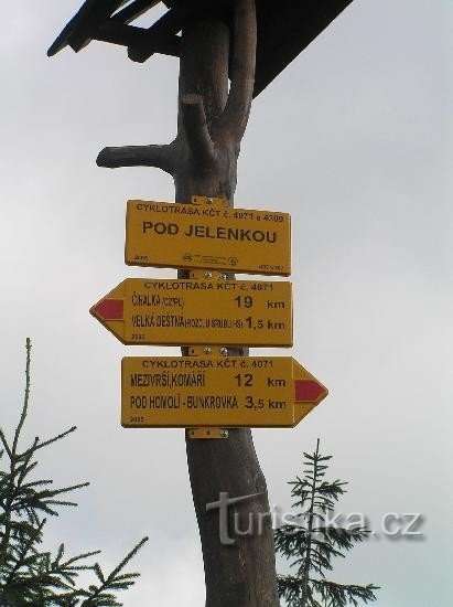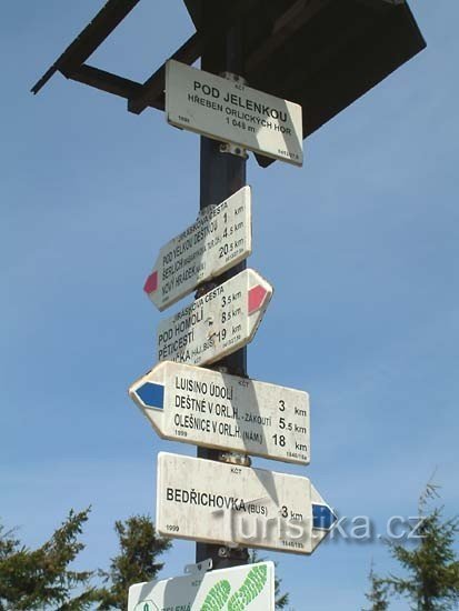 Rozcestí červené a modré turistické značky asi kilometry východně od Velké Deštné. Po červené značce můžete pokračovat dále přes celé Orlické hory. Modrá vede do Luisina údolí. Na druhou stranu se po modré značce dostanete do Osady Bedřichovky.