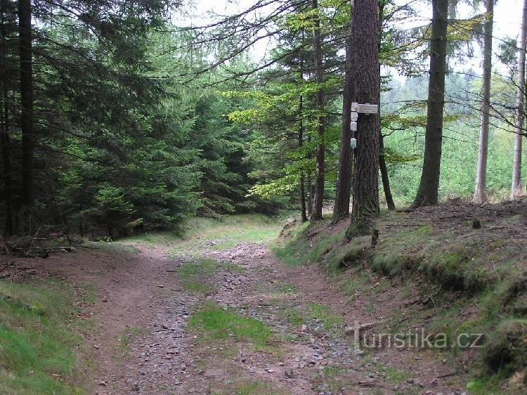 Rozcestí na žluté a modré turistické značce, severovýchodně od Nového Města nad Metují v Orlických horách.