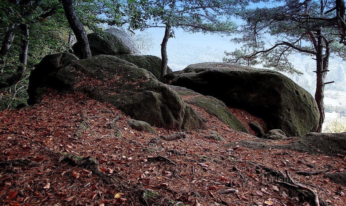 Venku začíná krásný podzimní den, takže na co čekat ? Rychle vstáváme, balíme si to nejnutnější na cestu a vyrážíme na výlet do okolí. Z autobusáku jedeme do Držkové spolu s turisty - horolezci, kteří míří k Předním skalám. My jdeme přes louku k hrušce, lesem až k samotě, odtud Ostrým stoupáním nad skály.