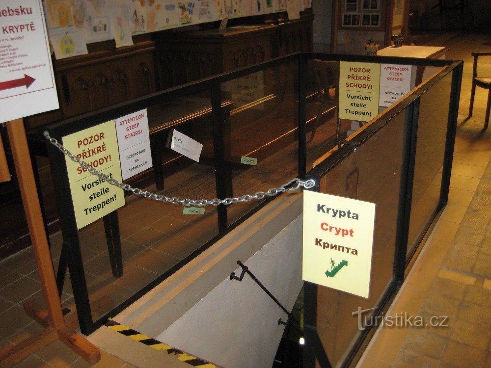 Do krypty návštěvník sestoupí z hlavní lodi chrámu po cca 20 úzkých schodech. Zde jsou k vidění nově zrekonstruované prostory krypty zahrnující velkou centrální místnost, tři malé místnůstky a spojovací chodbu do zazděné druhé části krypty (kde jsou pohřbené ostatky nalezené v kryptě včetně ostatků hraběnky Sidonie Šlikové). V kryptě je umístěna dlouhodobá expozice na téma pohřbívání na Chebsku a…