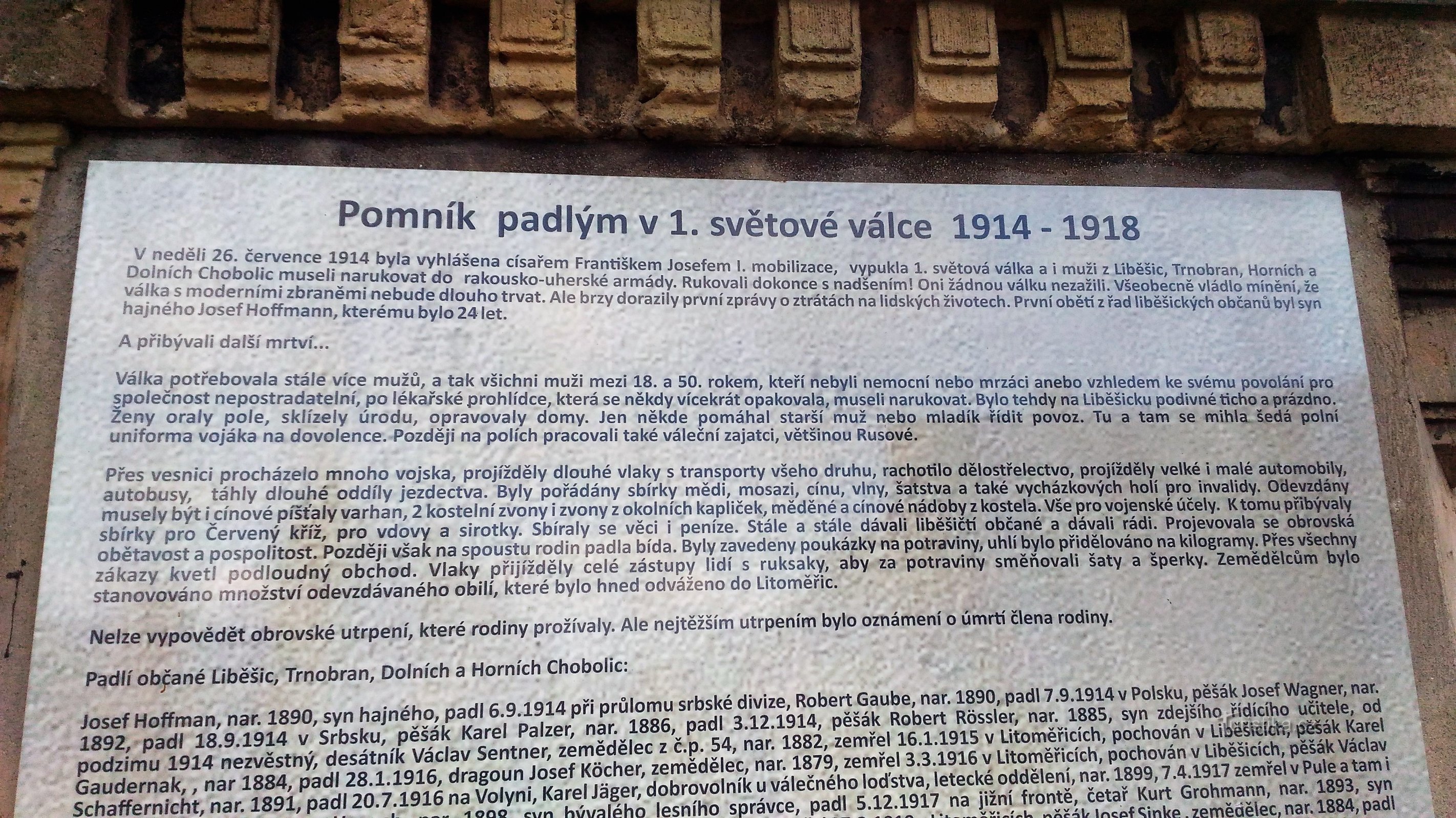 V průběhu války museli všichni muži ve věku mezi 18. – 50. rokem z Liběšic, Trnobran , Dolních a Horních Chobolic narukovat. Mnoho z nich ve válce zahynulo. Padlým byl v roce 1923 postaven u schodiště do kostela Nanebevzetí Panny Marie pomník, na kterém byla vytesána jejich jména. Po roce 1945, kdy byli němečtí obyvatelé vysídleni a ničilo všechno německé, byla jména na pomníku zalita betonem,…