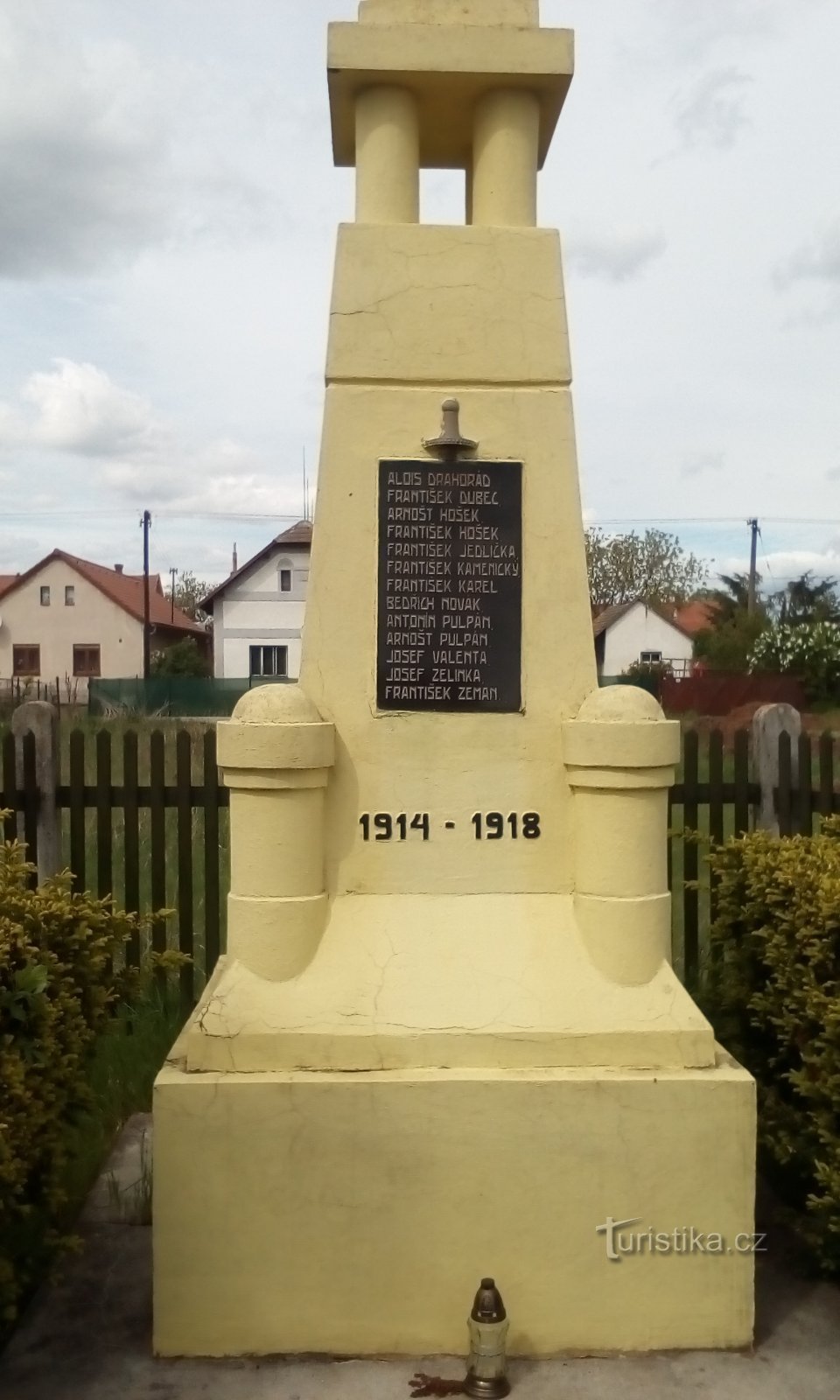 Na pomníku je nápis: 1914 – 1918 ALOIS DRAHORÁD, FRANTIŠEK DUBEC, ARNOŠT HOŠEK, FRANTIŠEK HOŠEK, FRANTIŠEK JEDLIČKA, FRANTIŠEK KAMENICKÝ, FRANTIŠEK KAREL, BEDŘICH NOVÁK, ANTONÍN PULPÁN, ARNOŠT PULPÁN, JOSEF VALENTA, JOSEF ZELINKA, FRANTIŠEK ZEMAN