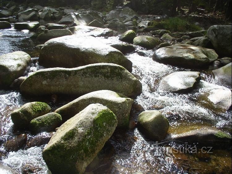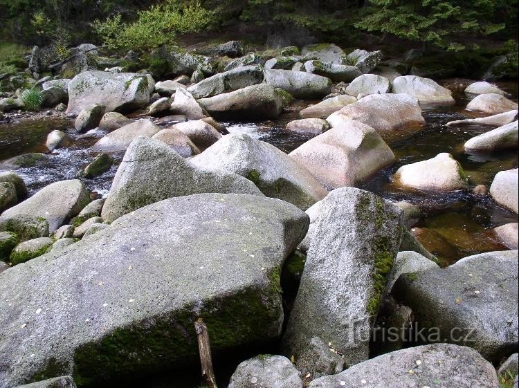 Kaňonovité údolí Vydry s peřejnatým řečištěm, obřími hrnci vymletými v žulových balvanech unášením drobného písku a štěrku proudem říčky.