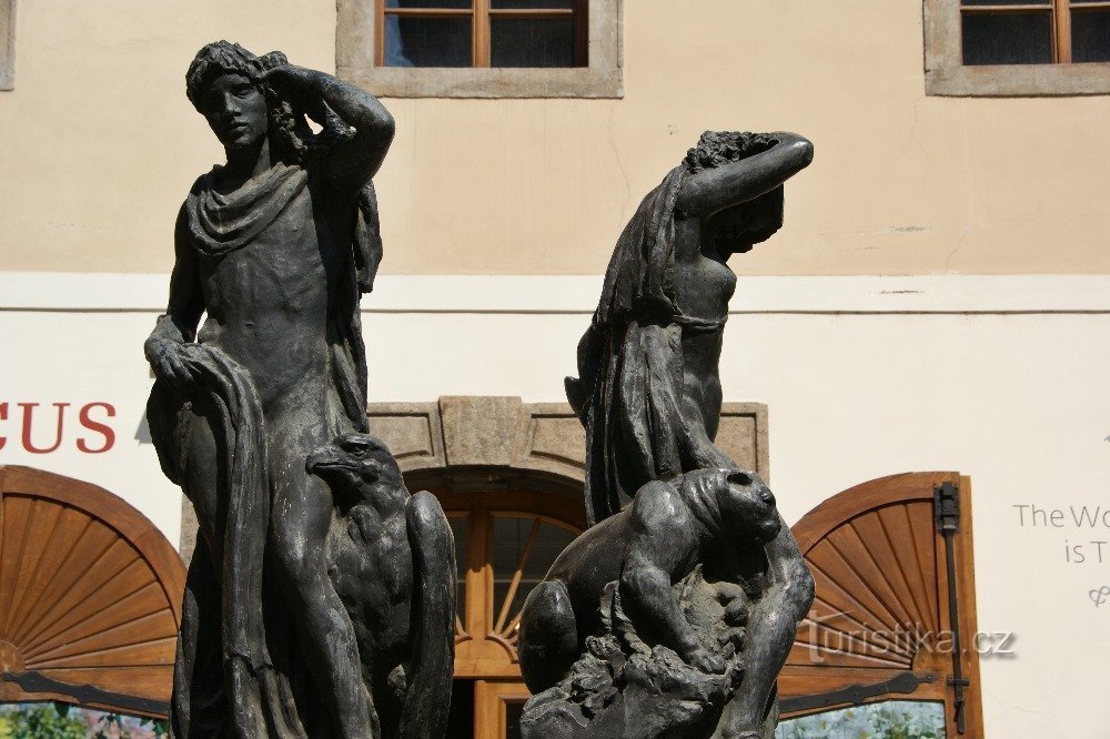 Na nádvoří staroměstského Ungeltu si před Granovským palácem můžeme prohlédnout pozoruhodné bronzové sousoší Den a Noc. Jedná se o dílo slavného sochaře, pocházejícícho z Nového Města na Moravě, Jana Štursy. Sousoší je umístěno na vysokém soklu a tvoří ho dvě – antikou evidentně inspirované – sochy. Jedna představuje mladého muže s orlem opřeným o nohu, druhá pak nahou dívku s pumou.