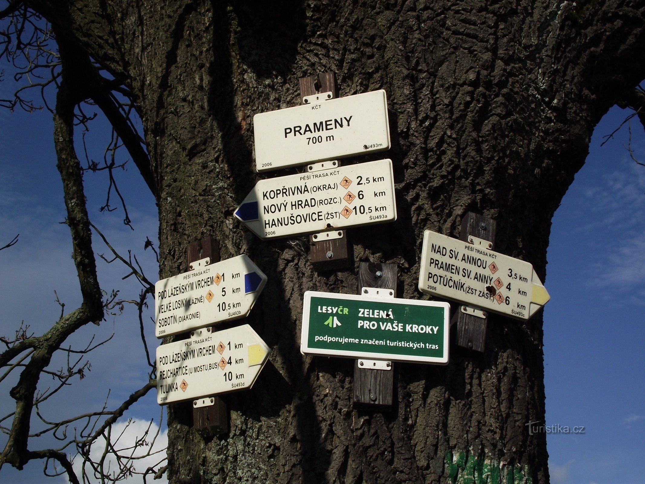 Rozcestník Prameny se nachází v nadmořské výšce 700 metrů na jednom z vrcholků Hanušovické hornatiny, „tyčících se“ mezi Šumperkem, Velkými Losinami a Hanušovicemi (nebo chcete-li Horním Bohdíkovem, Rejcharticemi, Kopřivnou a Potůčníkem) a setkává se zde modrá a žlutá turistická značka. Rozcestník je umístěn na kmeni stromu (javor) na místě, kde od roku 1570 stávala hornická osada a pozdější…