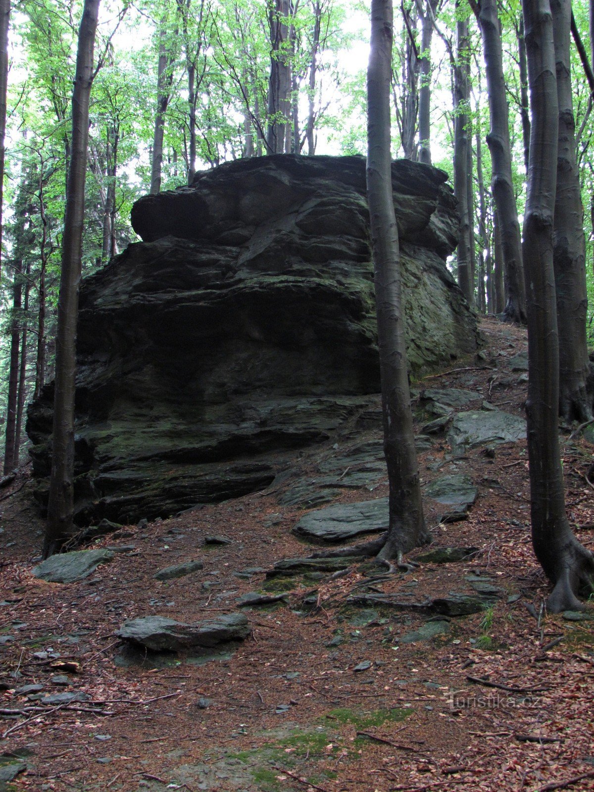 Pokud u novodobějšího poutního kostela Panny Marie Pomocné neodoláte značení Hornické naučné stezky, směřující za tajemstvími Příčného vrchu, čeká vás nejprve poměrně prudké stoupání lesem na hřeben. Tady narazíte na tur.rozcestník, neboť se tu k naší trase připojuje modrá značka, šplhající sem nahoru ze Zlatých Hor přes zříceniny Edelštejna. Obě značení pak spolu vesele pokračují směrem k…