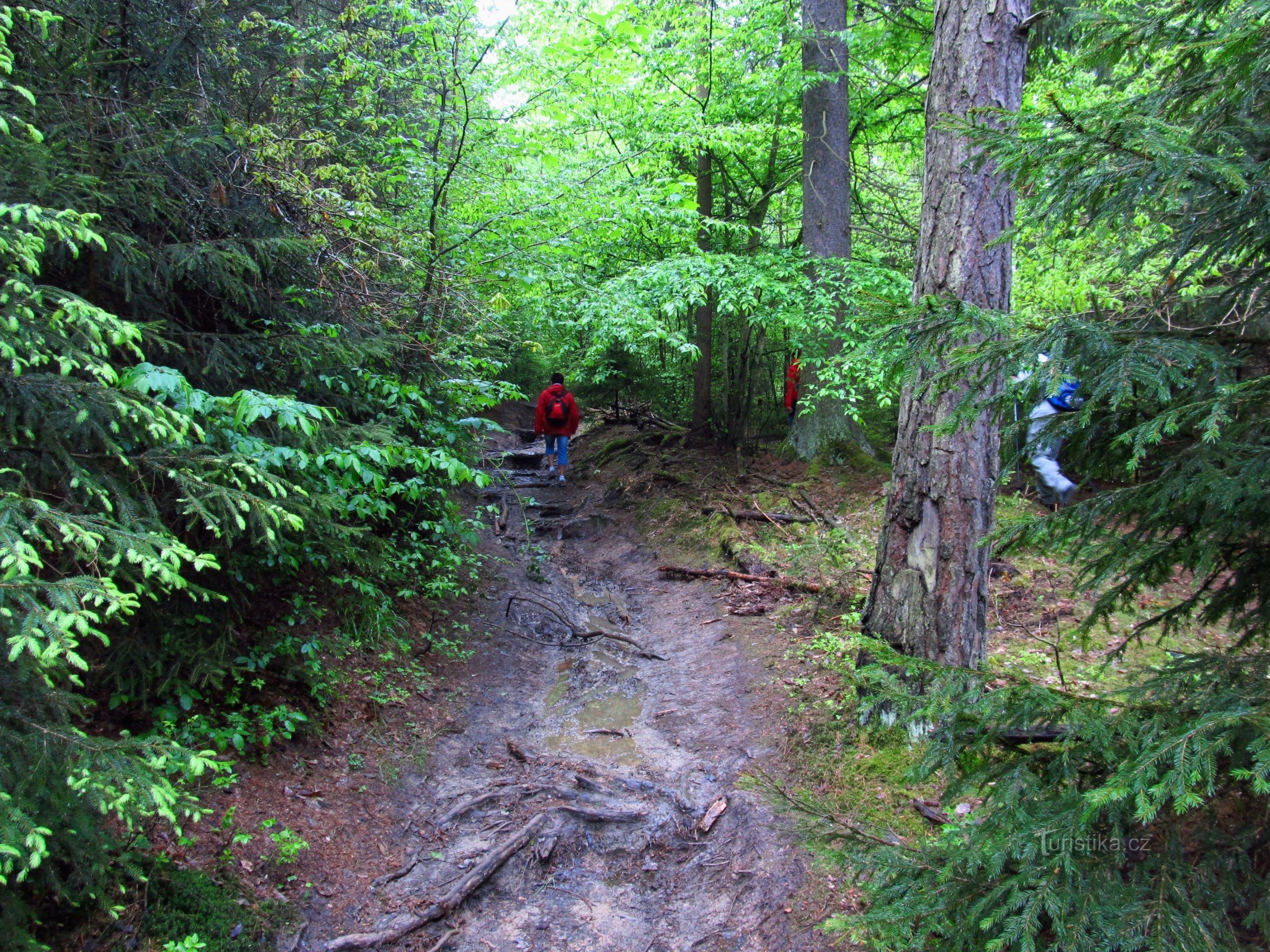 Počasí je sice na vážkách, ale mohlo by být i hůř. Z návsi se vydáváme po červené směrem k…