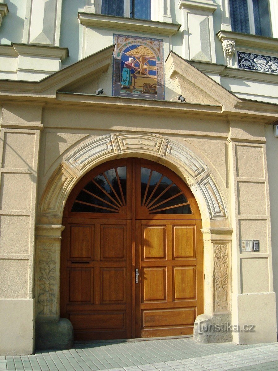 Na severní straně náměstí T. G. Masaryka v Prostějově stojí dům U Zlaté Studny s ranně gotickým jádrem. Vchod do domu je raně barokním pískovcovým portálem z r. 1666 s reliéfní výzdobou v podobě vázy s květinami na dřících obou pilířků a rozety na vnitřním oblouku, nad kterým je domovní keramické znamení od Jano Köhlera z r. 1936.