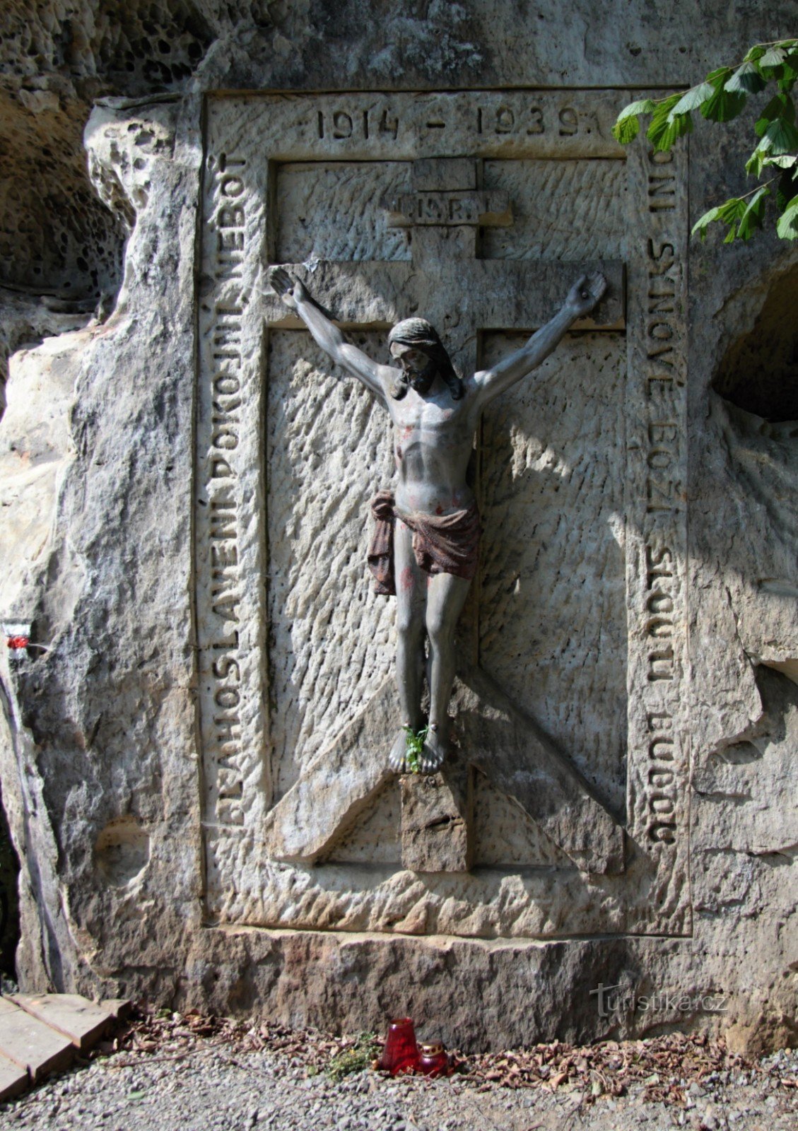 Vytesáný reliéf ukřižovaného Krista.