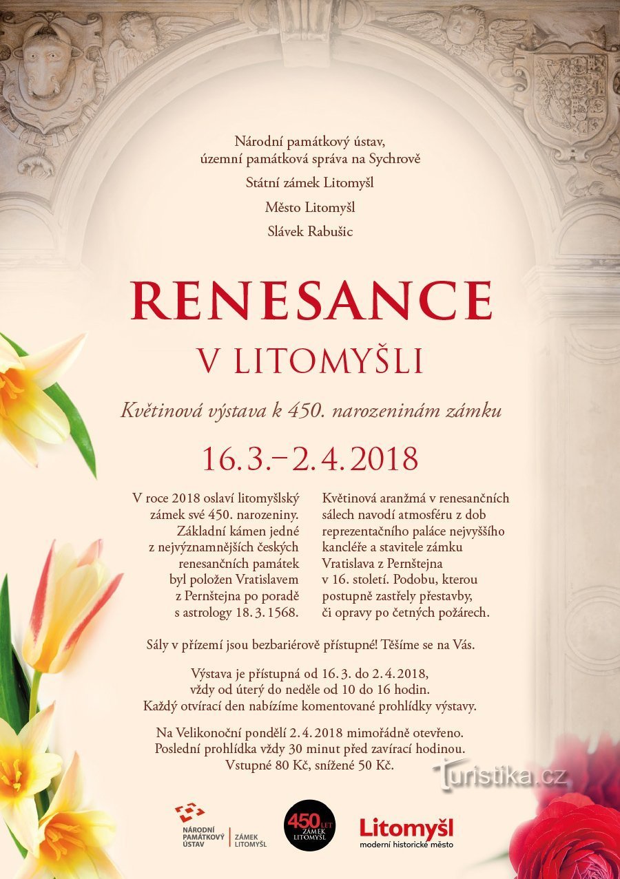 Státní zámek Litomyšl připravil od 16. 3. do 2. 4. 2018 výstavu Renesance v Litomyšli – květinovou výstavu k 450. narozeninám zámku (1568–2018). Uskuteční se v jediných dochovaných renesančních sálech v zámeckém přízemí, které je i bezbariérově přístupné.