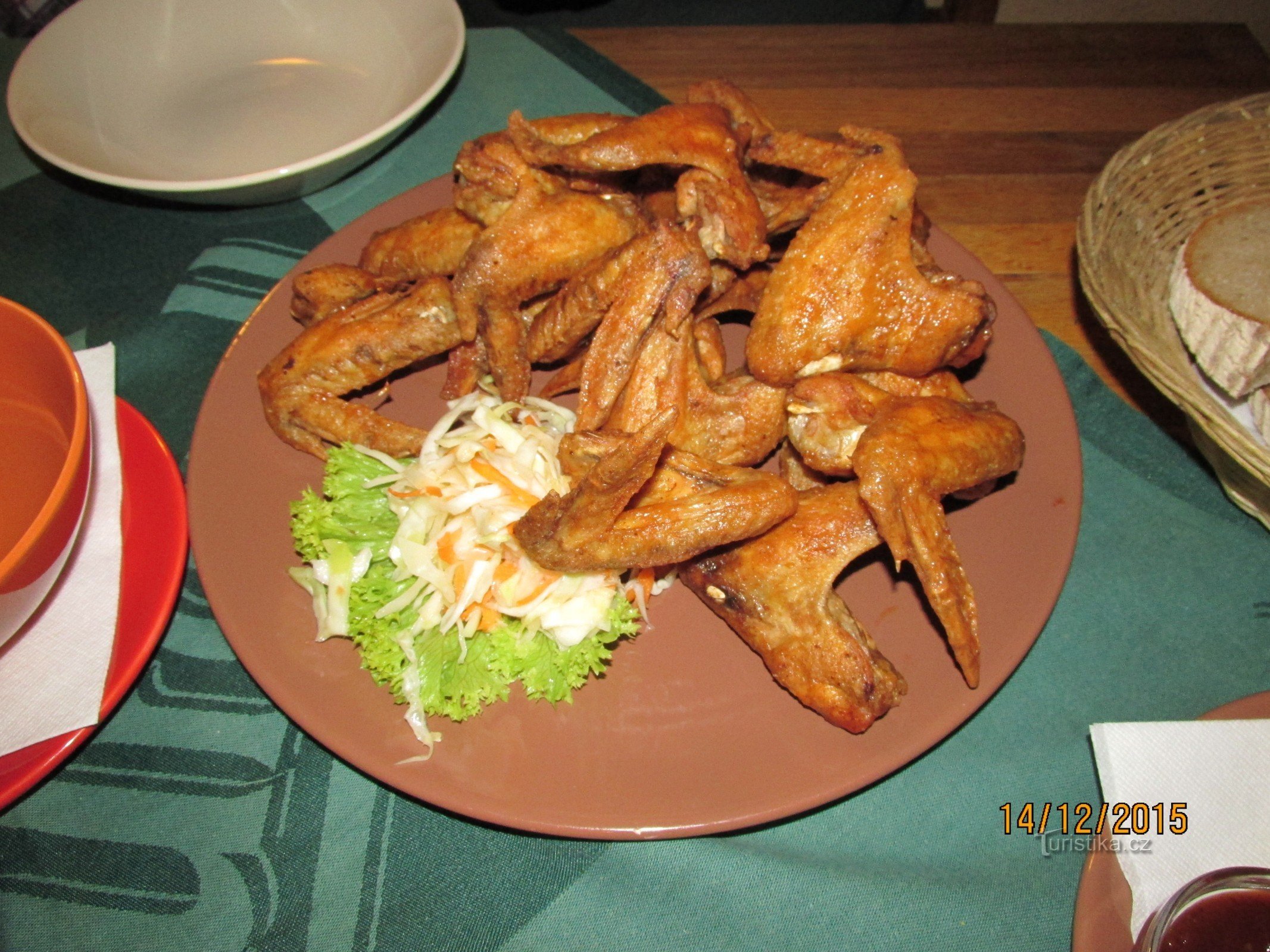 Restaurace je rozdělena na kuřáckou a nekuřáckou část. Nahoře je výčep a my scházíme po schodech dolů. Je zde útulné prostředí. Naše jídlo skýtá pečená křídla, 3 různé dipy a chléb. Tedy…