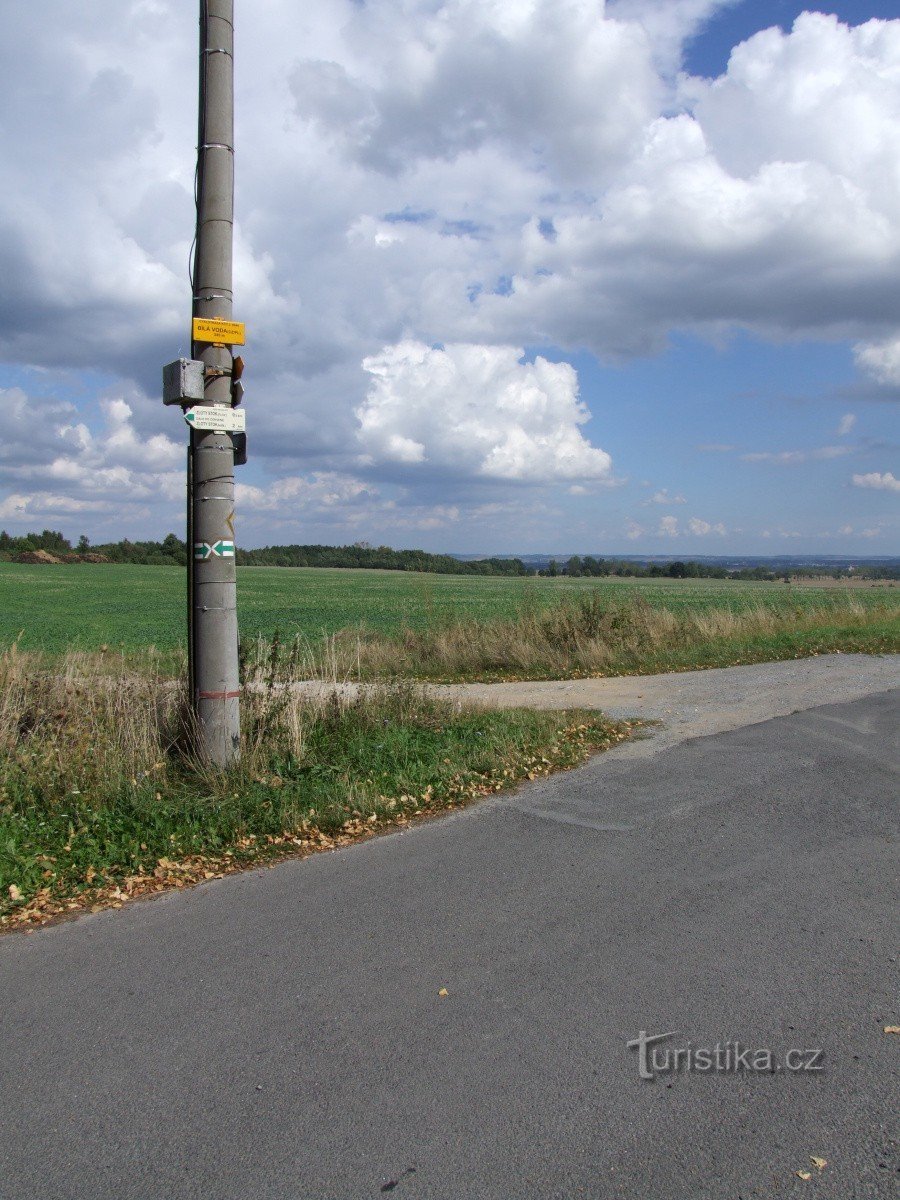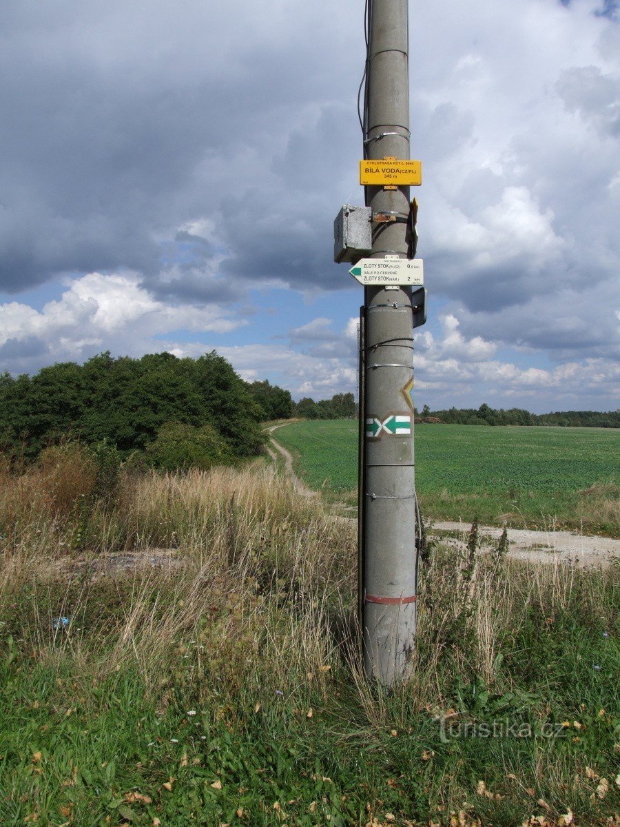 Rozcestník na křižovatce místních komunikací ani ne 300 metrů od Česko-Polské hranice upřesňuje směr zde procházející zelené turistické trasy. Ta odtud vede jedním směrem do Polska, kde v Blotnici Górne končí a na druhou stranu směřuje do Vsi Bílá Voda a dál na jihovýchod do Javorníka. Navíc rozcestník ještě ukazuje směr cykloturistické trasy č. 6044, která odtud míří také do Javorníku, tentokrát…