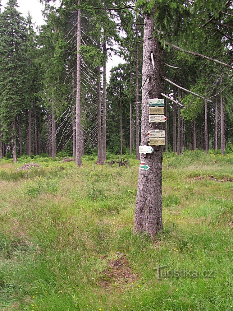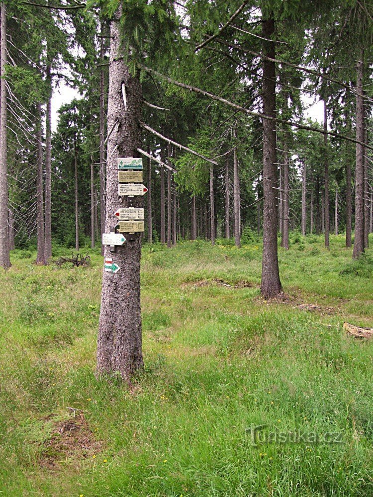 Rozcestím při hlavní silnici z Horní Blatné na Ryžovnu v místě odbočky na Pernink prochází dvě turisticky značené trasy. Po červené turistické značce se západním směrem po silnici dostaneme na Blatenský vrch k rozhledně, potom do Horní Blatné a dál přes Jelení a Rolavský vrch k Rájeckému údolí a do Kraslic. Opačným směrem po silnicí podle červené značky dojdeme na Hřebečnou, odkud můžeme…