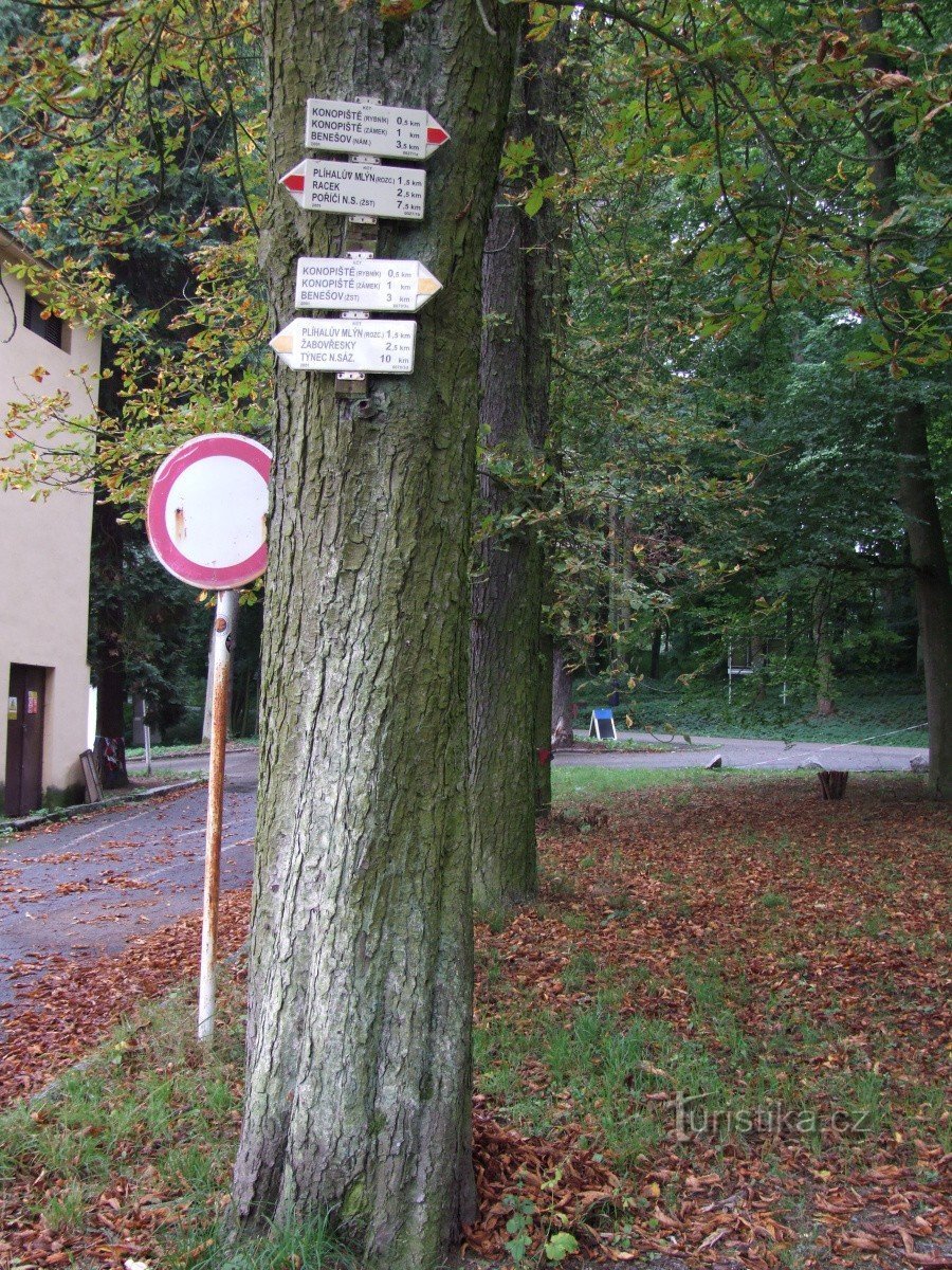 Rozcestím u centrálního parkoviště a vstupu do parku pod konopišťským zámkem prochází červená a žlutá turisticky značená trasa. Žlutá trasa sem přichází z Týnce nad Sázavou a pokračuje dál okolo Konopišťského rybníka a zámku ke tři kilometry vzdálené železniční stanici v Benešově. Červeně značená trasa k parkovišti u zámku Konopiště přichází od severu z Poříčí nad Sázavou a od rozcestí míří ke…