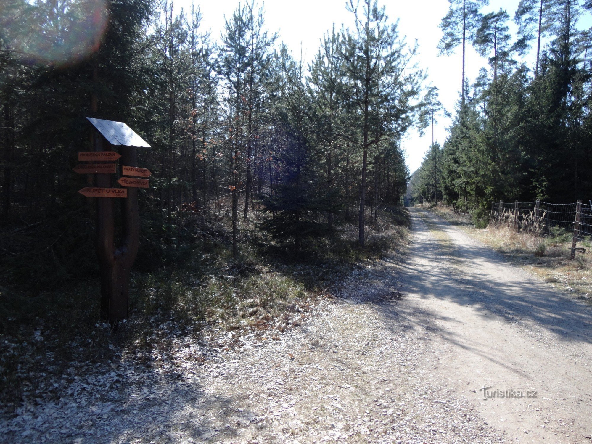 Pod tímto podivným názvem se skrývá rozcestí, které bylo vybudováno Městskými lesy HK v křižovatce lesních cest nedaleko známé asfaltové stezky Hradečnice. Nejedná se tedy o turistický rozcestník, které zřizuje KČT. Směrníky zde ukazují cestu do několika směrů, k lesní komunikaci Třebechovka, k Pánovu palouku, k bufetu U Vlka a ke sv. Hubertu.