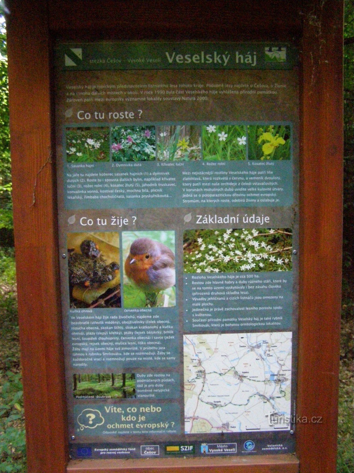 Turistický rozcestník NS Češov-Vysoké Veselí, který se nachází v lesní křižovatce ve Veselském háji, ukazuje turistům cestu do Češova dvěma směry, přes Velešice, Kozojedy a přes Vysoké Veselí.