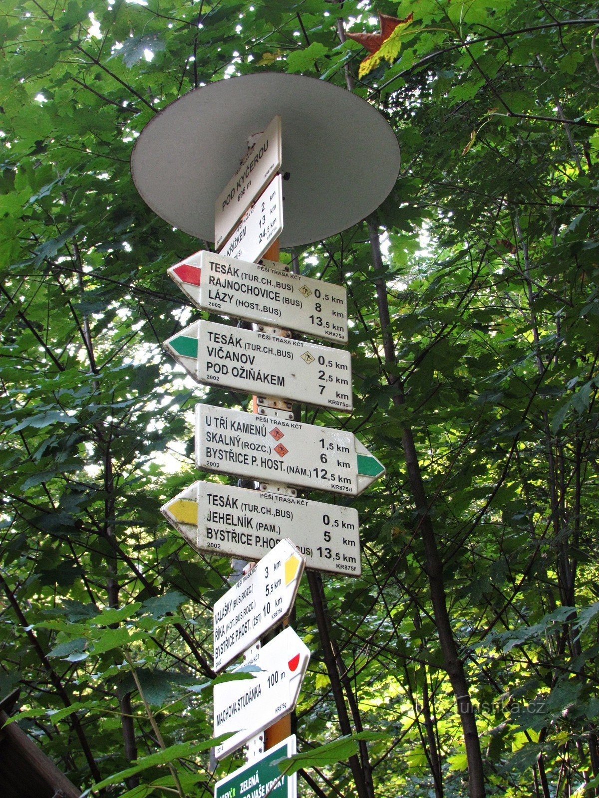 Na významné turistické rozcestí Pod Kyčerou (698m) narazíme, pokud se vydáme po barvách hned čtyř tras od zastávky busu na Tesáku směrem na jihozápad. Je od ní vzdáleno sotva pět minut chůze lesní cestou po mírně stoupajícím hřebenu. Ti, kteří nestihli doma posnídat, mohou usednout ke krytému přístřešku s lavičkami a utišit řvoucí žaludky, ti sytí pročíst informační tabuli, zacestovat prstem…