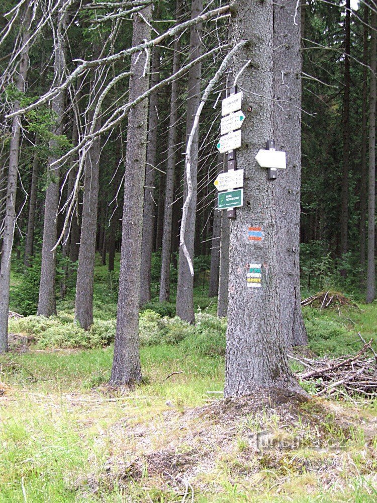 Šipky rozcestníku umístěného u křižovatky místních lesních komunikací ukazují směry dvou turistických tras. Zeleně značená trasa sem přichází z Nejdku a pokračuje dál na sever okolo Perninského vrchu a Liščí hory k Horní Blatné. Žlutá trasa odtud míří k 600 metrů vzdálené železniční stanici Nejdek - Sejfy zastávka, přičemž na druhou stranu žluté značení směřuje západně přes Tisovský vrch okolo…