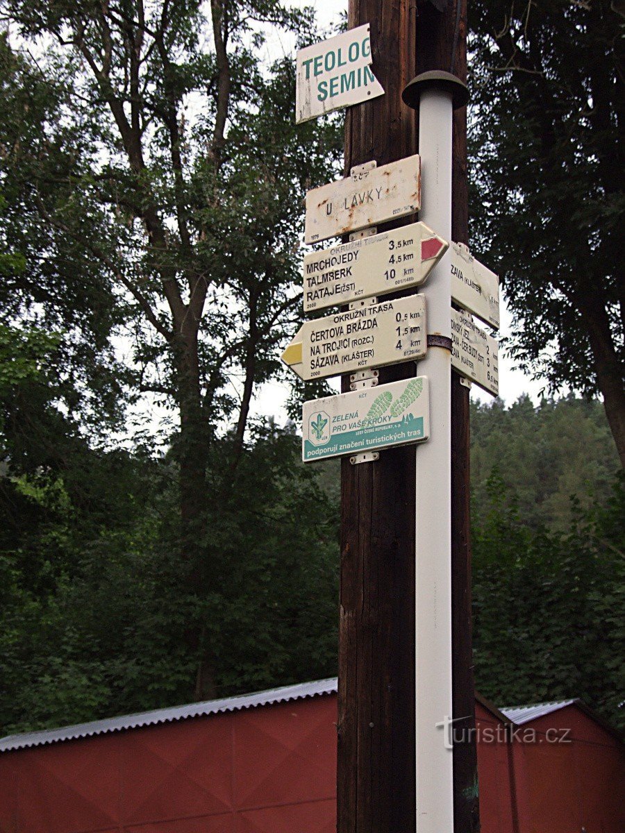 Rozcestník stojící kousek od severního konce můstku pro pěší přes řeku Sázavu upřesňuje směr dvou turisticky značených cest. Žlutě značená trasa, která tudy prochází, je vlastně vyhlídkovou stezkou a slouží jako poznávací okruh po městečku Sázava a přilehlého okolí. Červená trasa sem přichází od Černých Bud kolem sázavského kláštera a pokračuje dál přes Talmberk a Rataje nad Sázavou k Českému…