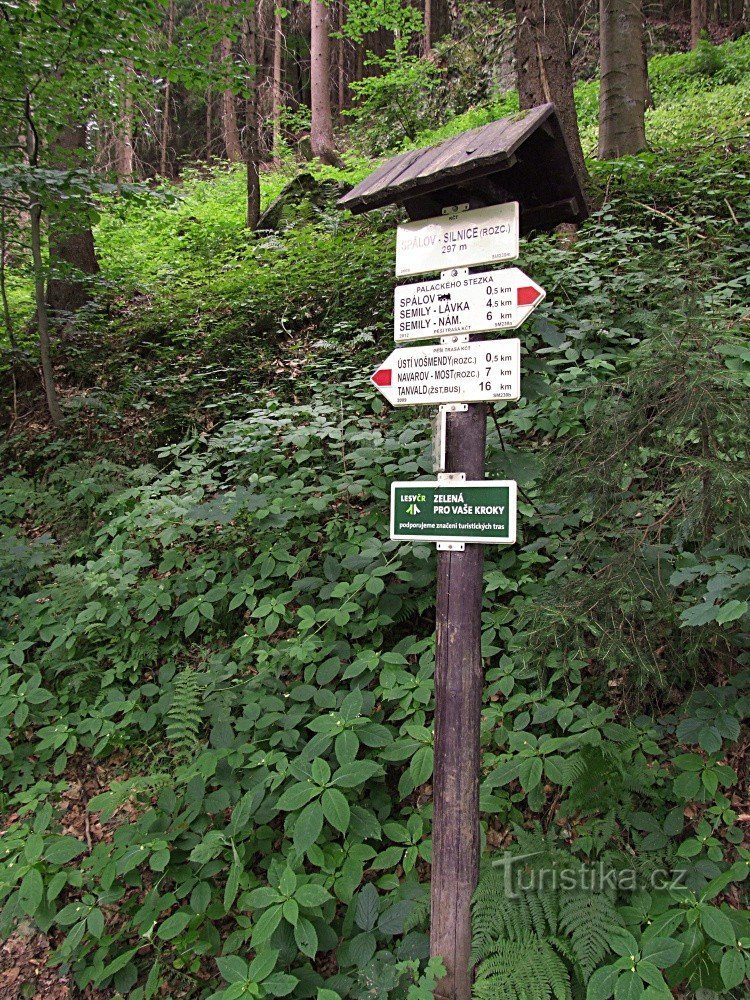 Rozcestník stojící u silnice č.288 z Železného Brodu na Bozkov označuje křižovatku modré a červené turistické stezky. Modře značená trasa má svůj počatek kousek odtud u soutoku Jizery a Kamenice u železniční zastávky a pokračuje od silnice do kopce po lesní cestě. Přes obec Spálov míří modře značená trasa okolo Myší skály, vrcholu Medence a Sejkorské kapličky až do centra města Semily. Červená…
