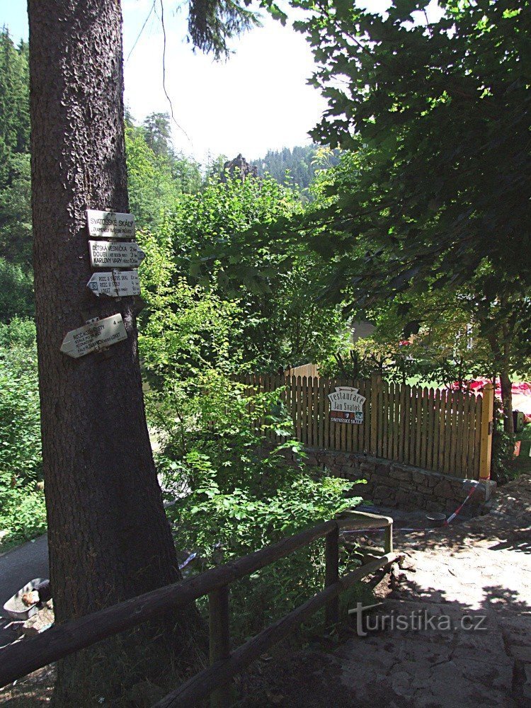 Rozcestník najdeme na letitém smrku mezi restaurací a lávkou přes řeku Ohři. Svůj výchozí bod zde má žlutě značená turistická stezka, která odtud směřuje k železničnímu nádraží Cihelny. Mimo krásného okolí zarámovaného Svatošskými skalami je rozcestí navíc zajímavé tím, že jím prochází Evropská dálková cesta E3, Atlantický oceán - Černé moře, která je na českém území vyznačena symbolem E3 v hrotu…