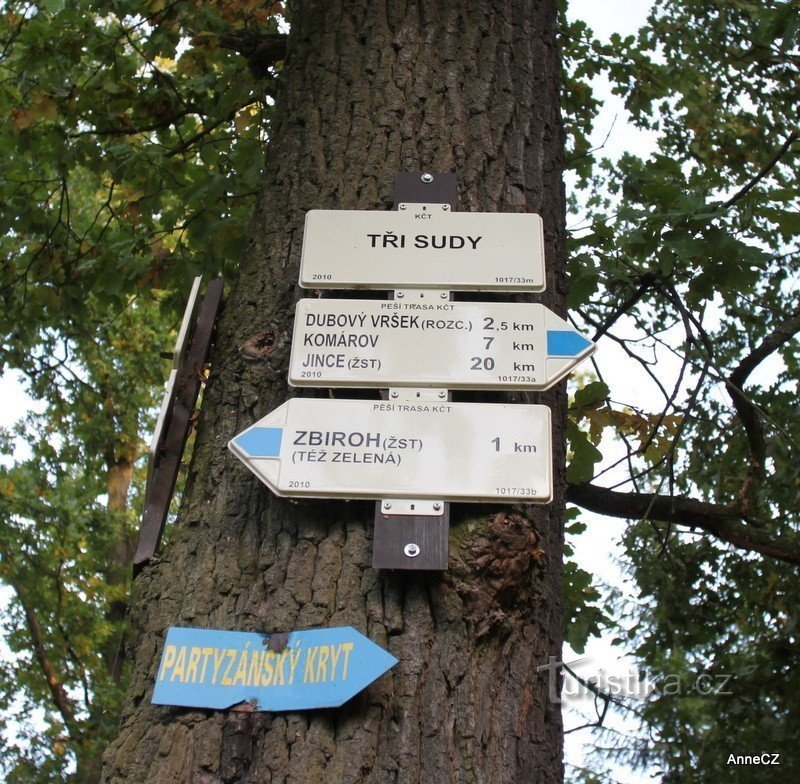 Rozcestník Tři Sudy u bývalé hlavní silnice Praha Plzeň, nedaleko prakoviště pro vozidla. Je zde možno nasednout i na kola a vyrazit po zelené či modré. Po zelené směr Zbiroh nebo po modré na Jince a Komárov. Jiným směrem po zelené na Cerhovice či Újezd.