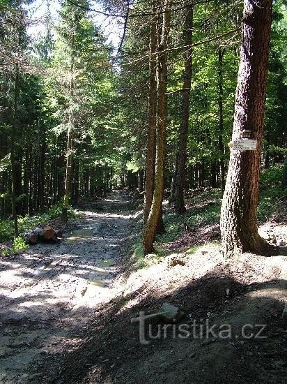 Rozcestí červené a žluté turistické značky pod vrcholem Polany, která se nachází jihovýchodně od obce Horní Bečvy. V blízkosti místo dalekého rozhledu.