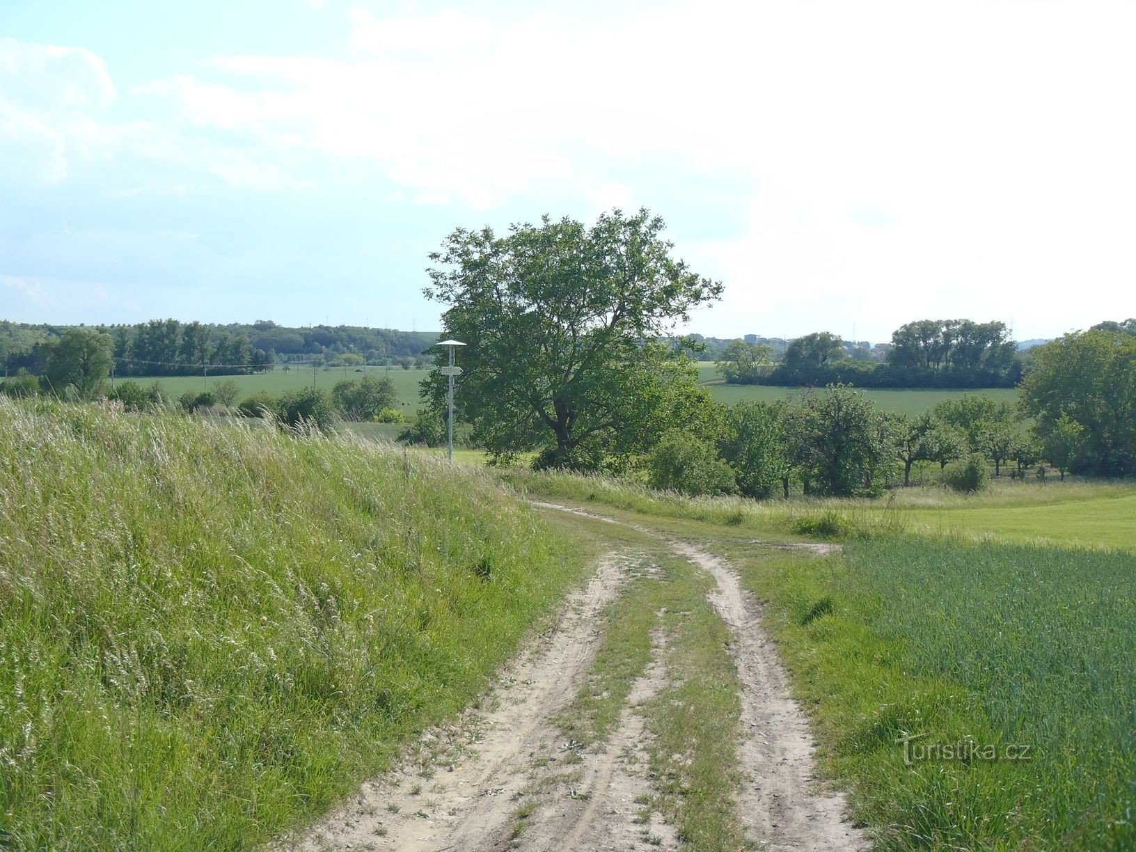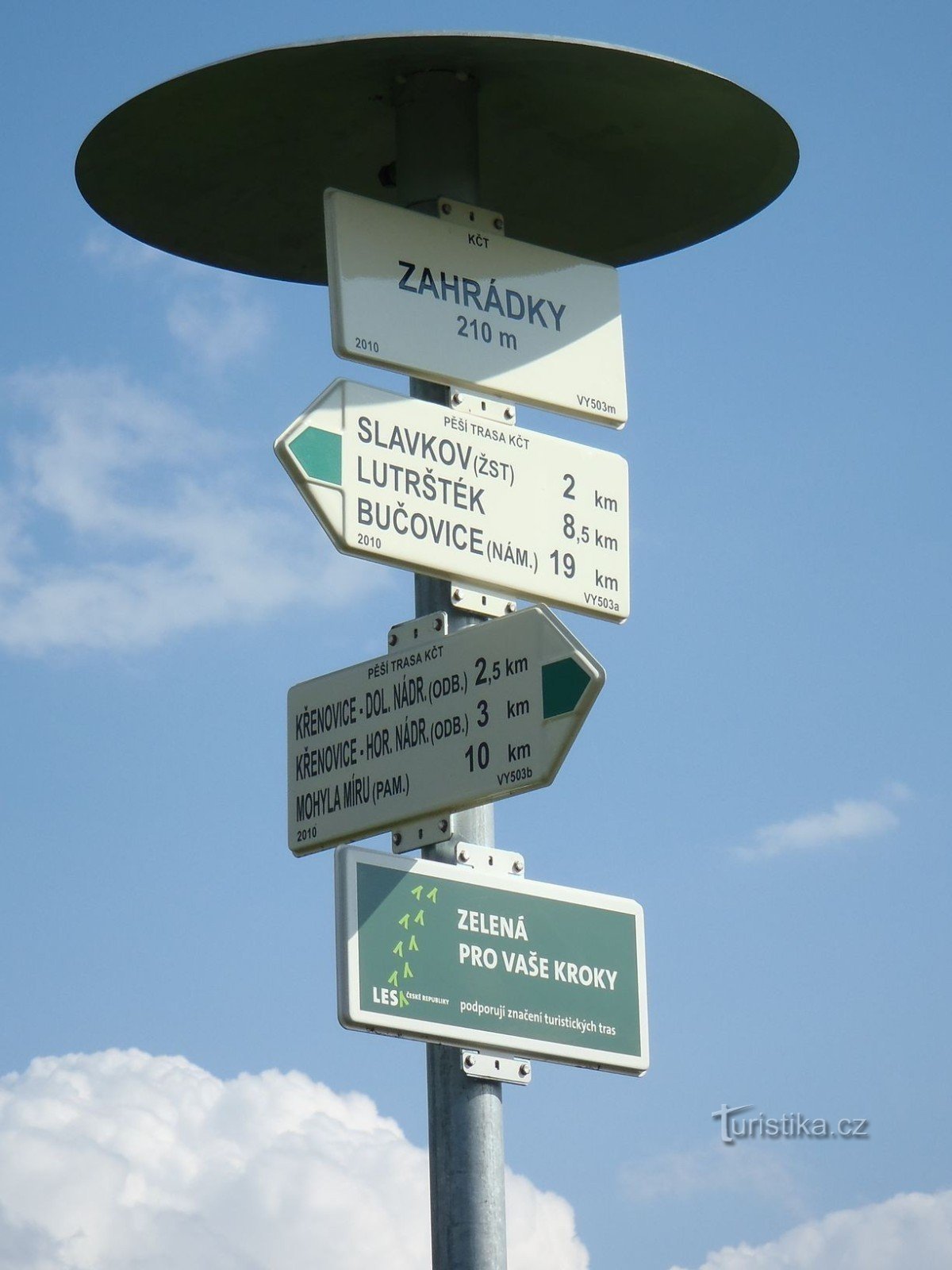 Rozcestník Zahrádky (210m) na zelené trase mezi Slavkovem u Brna a Křenovicemi u obce Vážany nad Litavou.