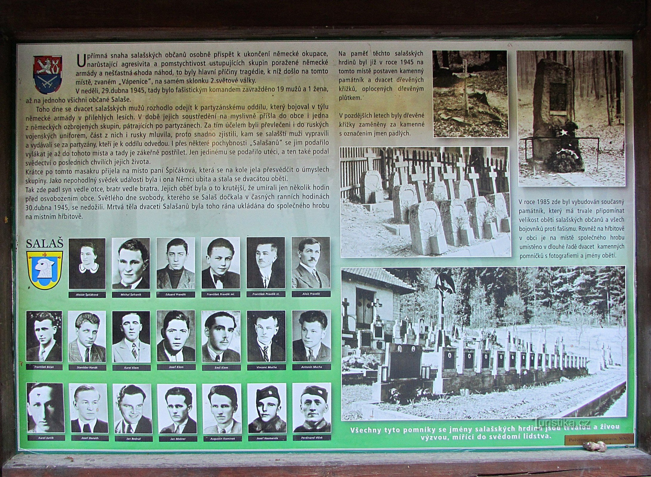 Asi 1.5 km od obce Salaš stojí nad břehem potoka Salašky velký Památník. Vznikl v roce 1985 na věčnou památku obětem krvavého masakru, který se zde udál doslova v posledních hodinách II.světové války. Vraťme se ale v čase do 29.dubna 1945. Je neděle a do obce Salaš přichází hajný Dobeš na nábor nových posil do partyzánského oddílu OLGA. Oddíl má za sebou řadu úspěšných bojových střetů, fašistům…