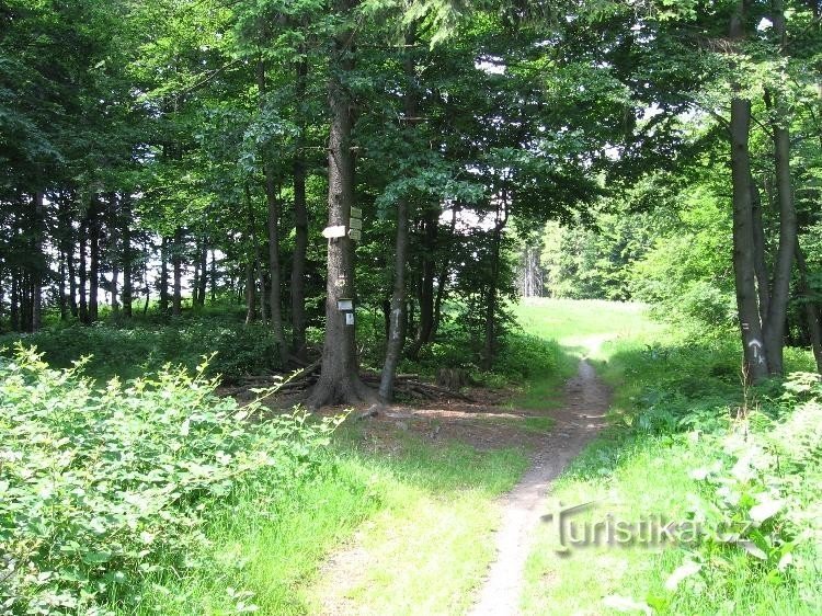 Rozcestí červené a žluté značky, nedaleko vrcholu Tanečnice, severním směrem od Nového Hrozenkova.