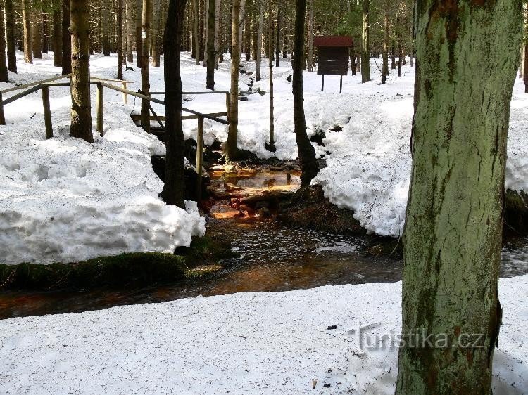 Nedaleko od rozcestí je na levém břehu Hamerského potoka vydatné okrouhlé prameniště železité vody se žlutohnědým povlakem, podle něhož je tradičně nazýváno Sirný pramen, ačkoliv jev se sírou nijak nesouvisí. V železité vodě žije bakterie Leptothrix ochracea, která shromažďuje železité sloučeniny a vytváří rezavé kašovité shluky. K prameni vede po dřevěných můstcích upravená odbočka ze zelené…
