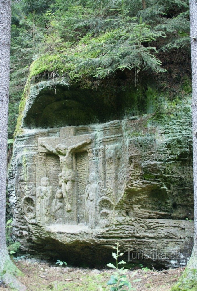 Půvabný skalní reliéf Kalvárie se nachází na půli cesty mezi obcemi Vojtěchov a Jestřebice - tedy na středočeském Kokořínsku - a rozhodně stojí za vidění. Jeho atraktivitu ještě zvyšuje skutečnost, že v blízkosti tohoto pozoruhodného díla neznámého umělce najdeme mnohé přírodní zajímavosti v čele se skalními Jestřebickými pokličkami, Vojtěšským dolem a Černou dírou.