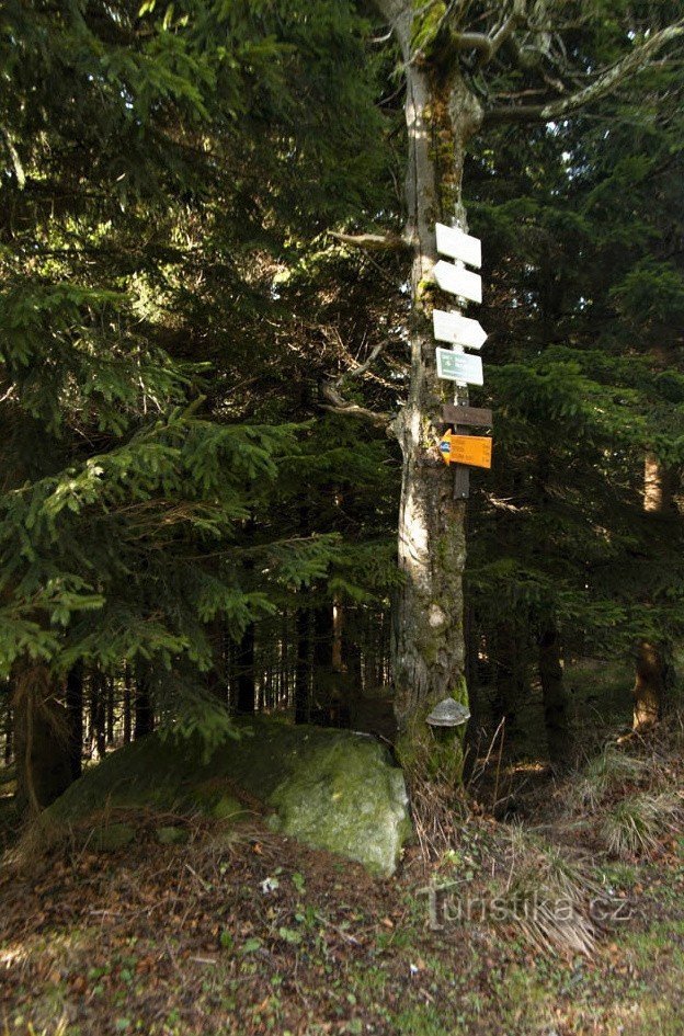 První textační informační místo na modré trase z Červenohorského sedla k rozcestí Kamzík nese název Skalní tabule. (Není to křižovatka, pouze průchozí bod). Tabulka značení prozrazuje, že je v místě turistický přístřešek, což celkem každý vidí.