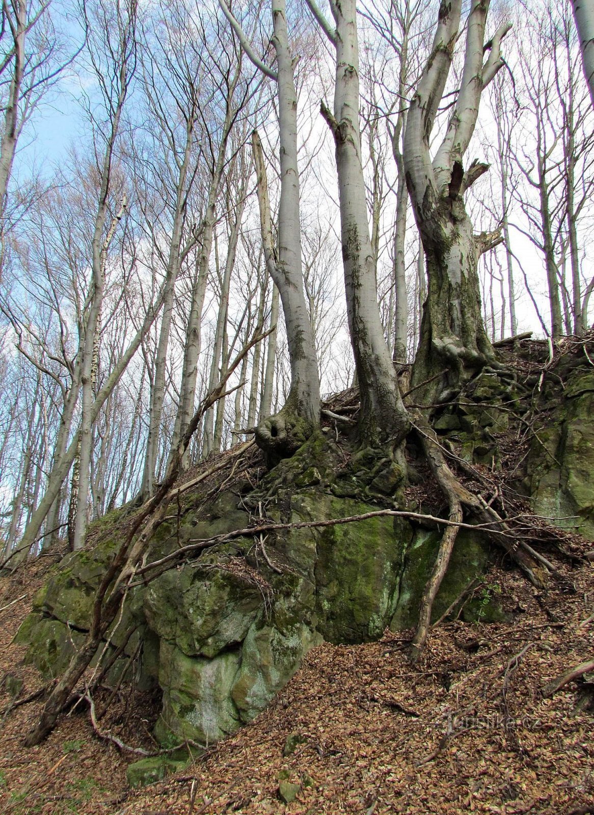 První z nich spatříme na západní straně, kde poblíž hlavního vstupu na zříceninu trčí přímo z hradního příkopu. Tato skála je ale pouze nízkým mrazovým srubem, zkrášleným bizarním bukem nad ním rostoucím.