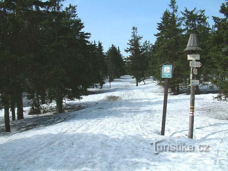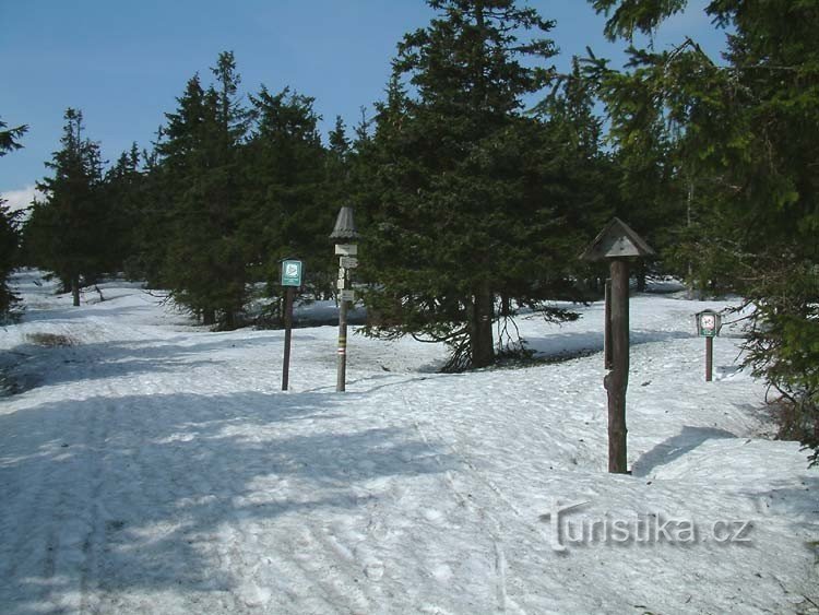 Rozcestí zelené a červené turistické značky. Nachází se asi 500 metrů od turistické chaty Švýcárna. Červená značka vede do Červenohorského sedla. Po zelené se dostanete do osady Kouty nad Desnou.