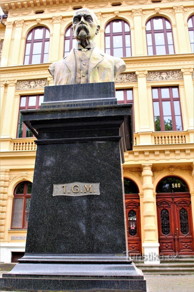 Pomník se nachází před budovou lesnické školy. Základem je tmavý mramorový podstavec, na kterém je umístěno poprsí T. G. Masaryka. Na čelní straně jsou velká písmena T. G. M. Po stranách pomníku je schodiště a za ním až k budově vydlážděná plocha. Pomník je dílem sochaře Alberta Králíčka z Nové Paky. Byl slavnostně odhalen 7. 5. 2008. V okolí pomníků roste několik keřů pěnišníku. Památka…