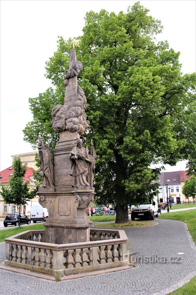 Sloup Nejsvětější Trojice se nachází v parkové části náměstí Míru. Je to velmi hezká barokní práce, která vznikla mezi roky 1751 – 1752. Výška sloupu je 8,8 metrů. Kolem sloupu je kamenný plůtek o šesti stranách. Podstavec od základu postupně mění tvar v šestibokou balustrádu s pilíři po stranách. Nad pilíři stojí sochy sv. Václava, sv. Jana z Nepomuku a sv. Floriána. Nad sochami má sloup tři…