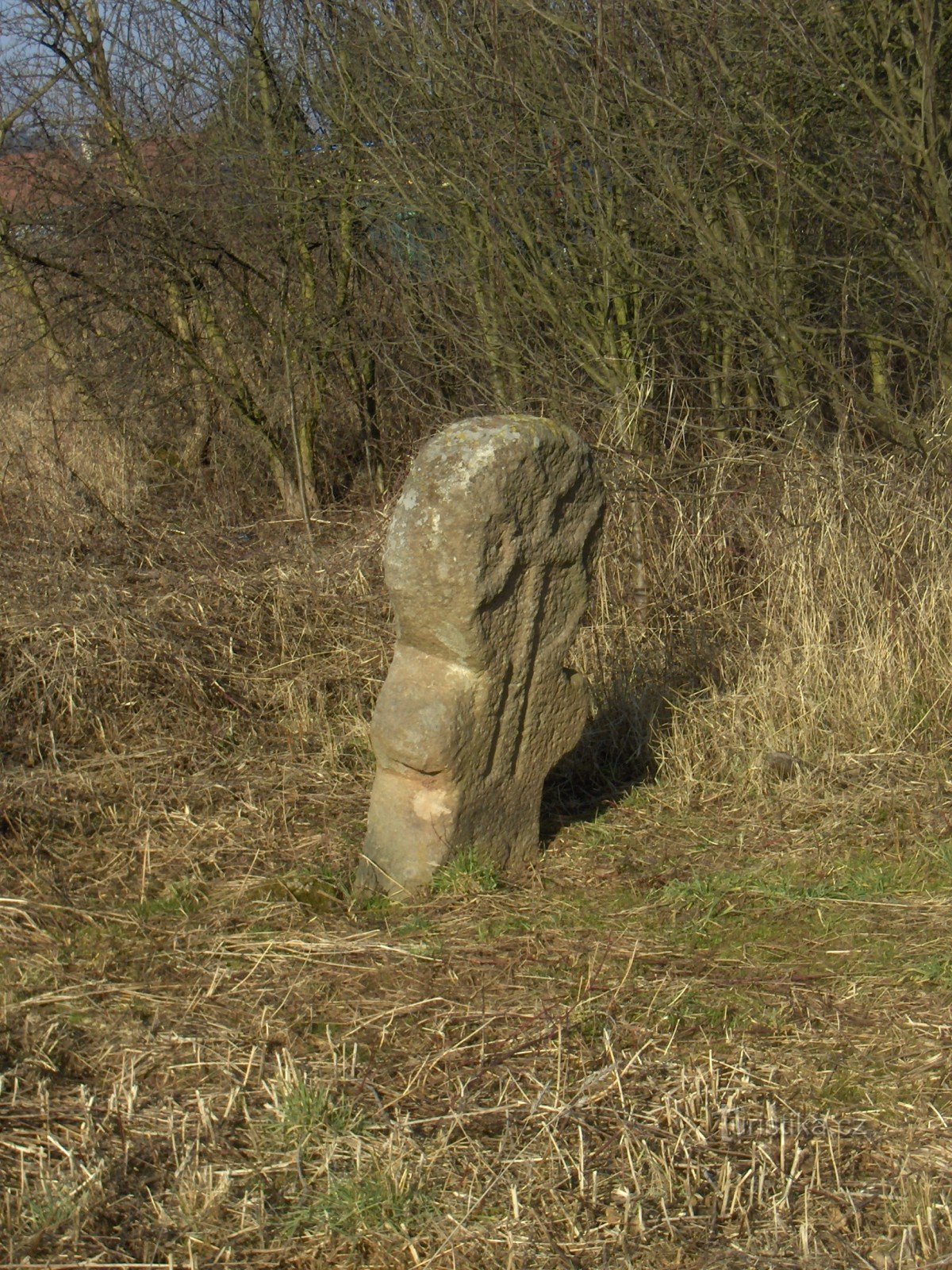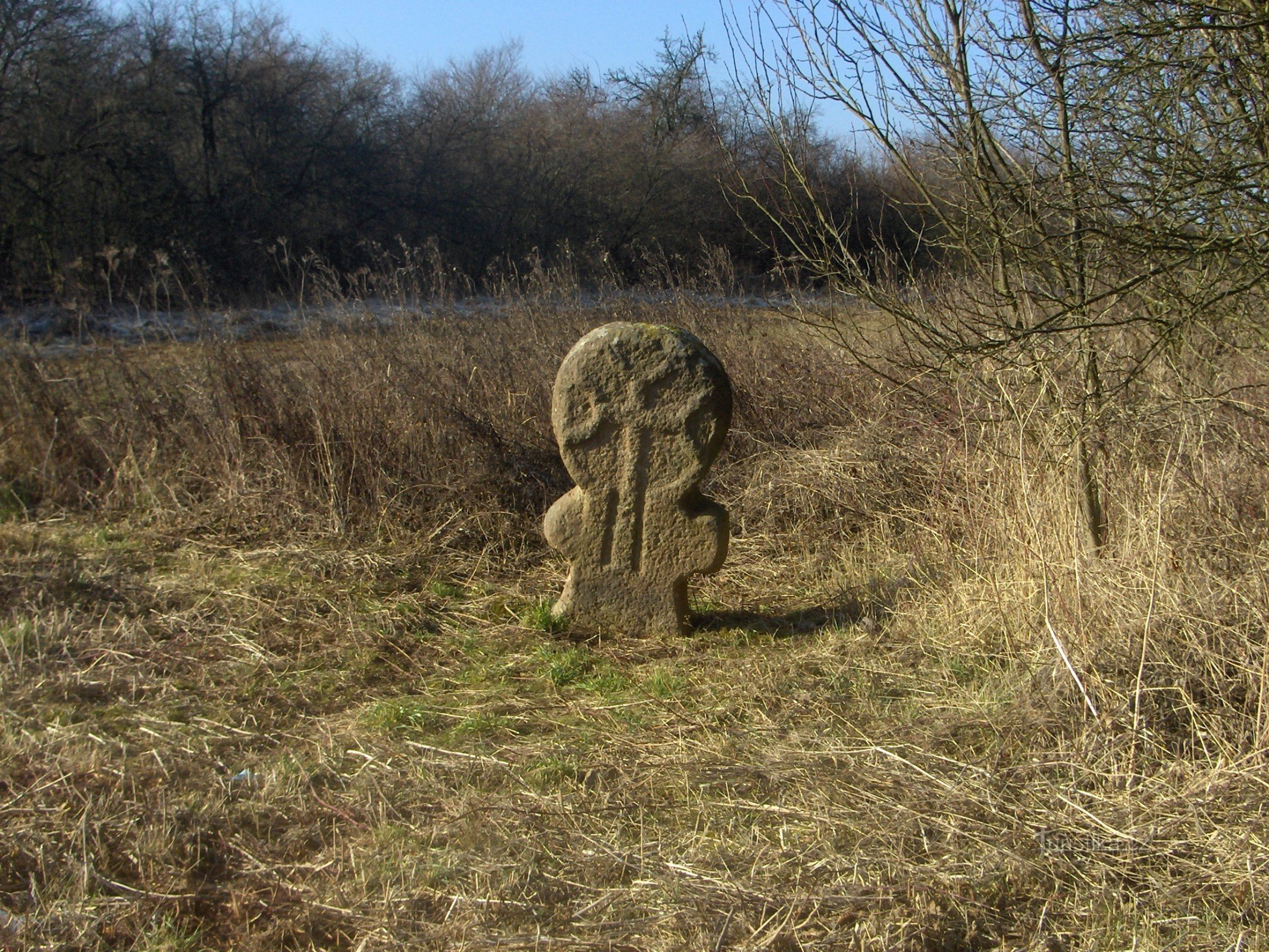 Vzácný a tajemný svědek historie stojí u křižovatky polní cesty a silničky vedoucí z obce Ležky na hlavní silnici Praha - Karlovy Vary. Ve vysoké trávě stojí 120 cm vysoký kámen ve tvaru lidské postavy s velkou kulatou hlavou, na které je vytesán reliéf berličkového kříže. Podle tohoto tvaru se jim říká antropomorfní kříže. Typ tohoto kříže patří mezi…
