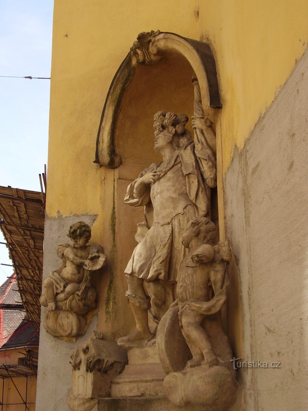 Postava Světce v životní velikosti stojí na nízkém hranolovém soklu. Na sobě má tradiční oděv římského vojáka s helmicí s bohatým chocholem, přičemž pozadí figury tvoří velký…