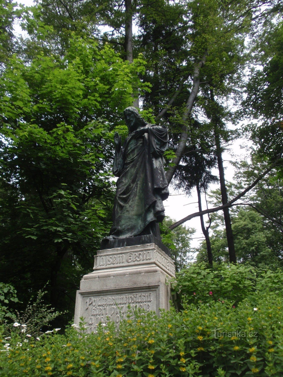Cestou po schodišti od Vodní kaple potkáme nejprve monumentální - třímetrovou, i přesto však neobyčejně líbeznou bronzovou plastiku Krista neboli Božského srdce Páně z roku 1919 od známého pražského sochaře Čeňka Vosmíka (1860 – 1944).