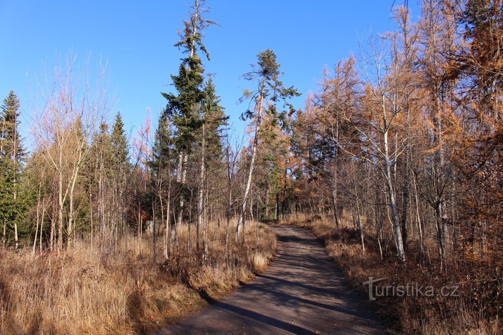 Autobusová zastávka nedaleko vísky Roku je naším výchozím místem. Odtud jdeme po silničce k uvedené vsi a při jejím západním okraji docházíme ke křížku. Odtud pokračujeme po modré, která mírně stoupá jižním svahem hory Kalovy (727 m.n.m.). To již máme po obou stranách cesty les, který i na konci listopadu stále čaruje barvami. Vládnou tady jehličnany, mezi nimiž hrají prim smrky. Rostou tady i…