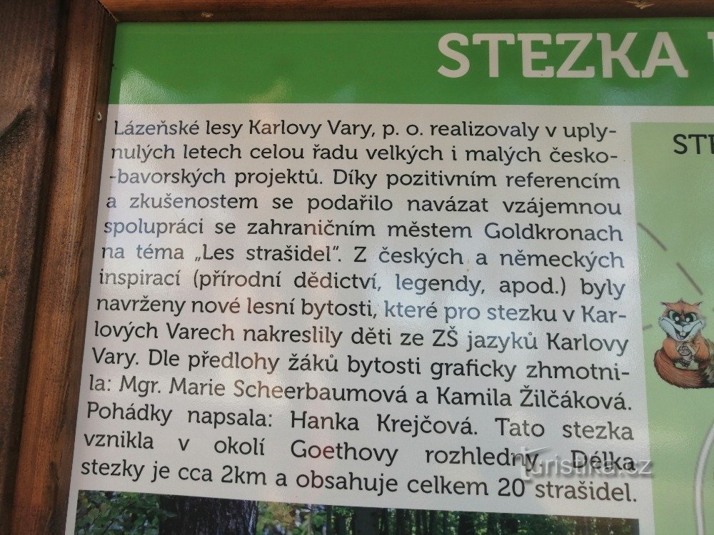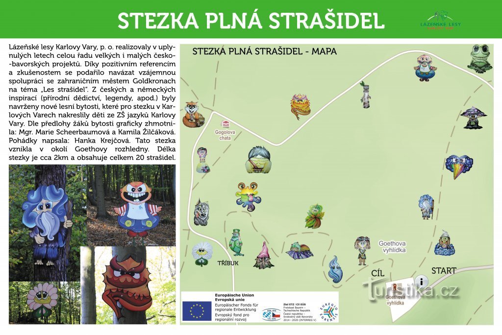 Stezka plná strašidel se nachází na adrese Goethova vyhlídka 244/2, Karlovy Vary, 360 01Na stezce je dvacet zastavení a každému vládne jedno strašidlo, které je doplněné krátkou pohádkou - viz foto.