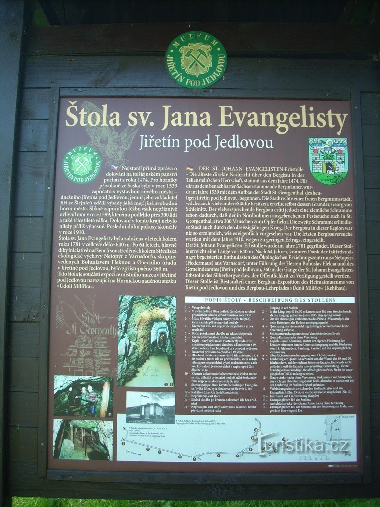 Štola sv.Jana Evangelisty,se nachází nedaleko Jiřetína pod Jedlovou.Jedná se o Krásnou ukázku toho,jak dříve lidé pracovali.Měli sice za dolování zde,tolik,co na povrchu za daleko delší dobu,ale za cenu poškozeného zdraví a neustálého nebezpečí ohrožení života.Zpřístupněná část štoly,měří 360 metrů a uvidíte zde i různé vymoženosti horníků tehdejší doby.Např.kolíky ,které ukazovali pohyb stěn…