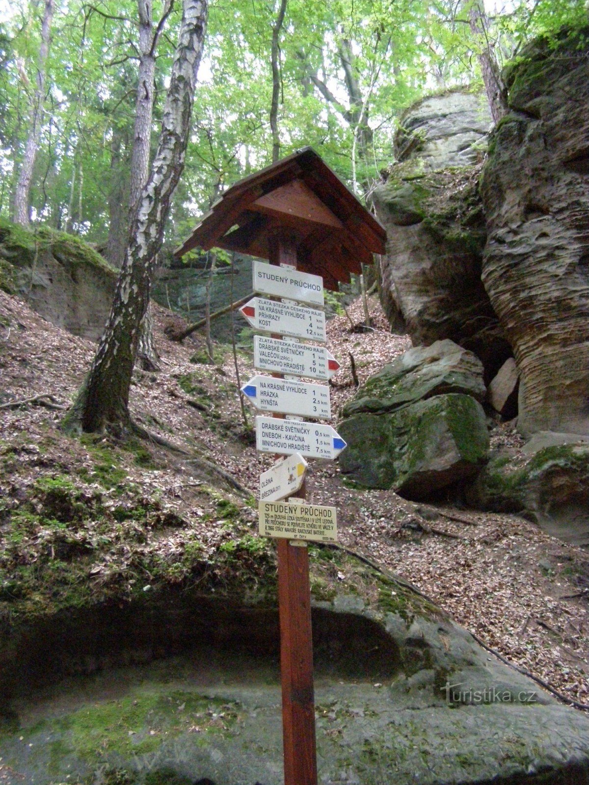 Skalní štěrbina Studený průchod se nachází cca v polovině cesty mezi Krásnou vyhlídkou a Drábskými světničkami. Skalní štěrbina o délce 125 metrů vznikla posunem okrajové kry na hraně pískovcového masivu Příhrazských skal.